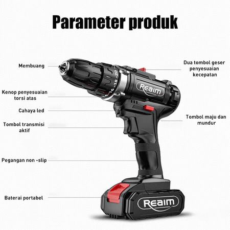 Mesin Bor Listrik Reaim Baterai 10mm Impact Drill Cordless Obeng Multifungsi