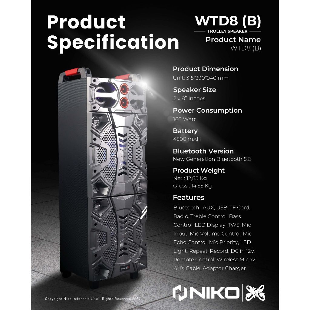 Niko WTD8B Speaker Bluetooth Karaoke Wireless Portable Super Bass Aktif BONUS 2 Pcs Mic Wireless