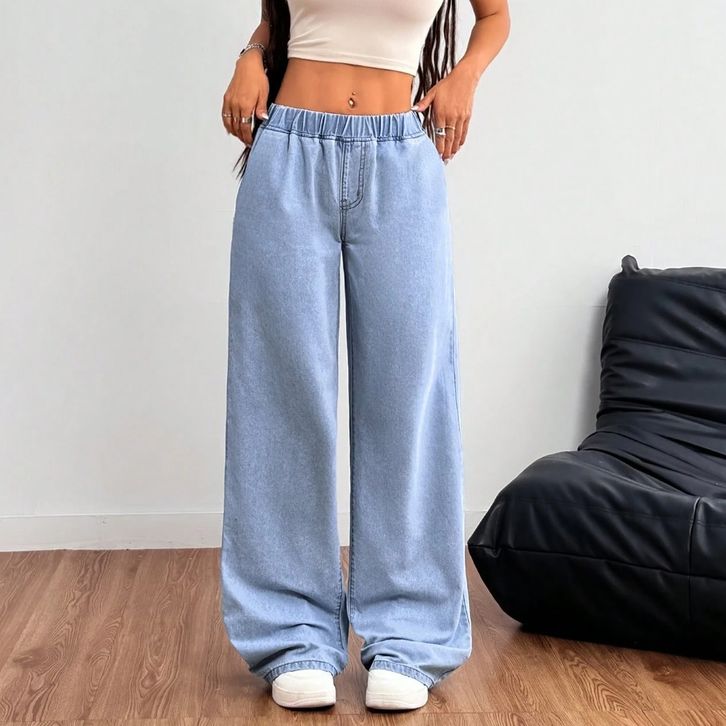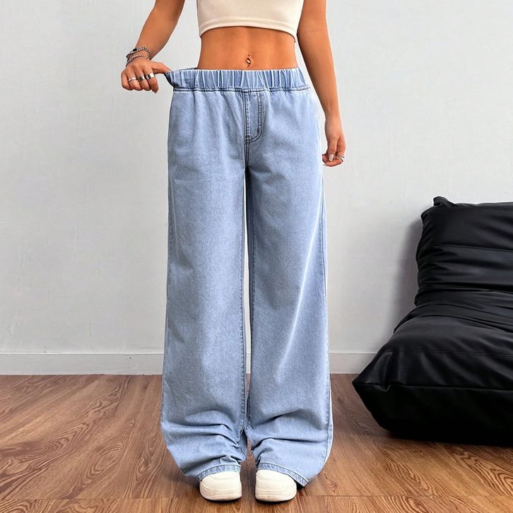 Celana Jeans Wanita Terbaru Elastic Waistband Casual Solid Color Straight Ladies Baggy Denim Pants