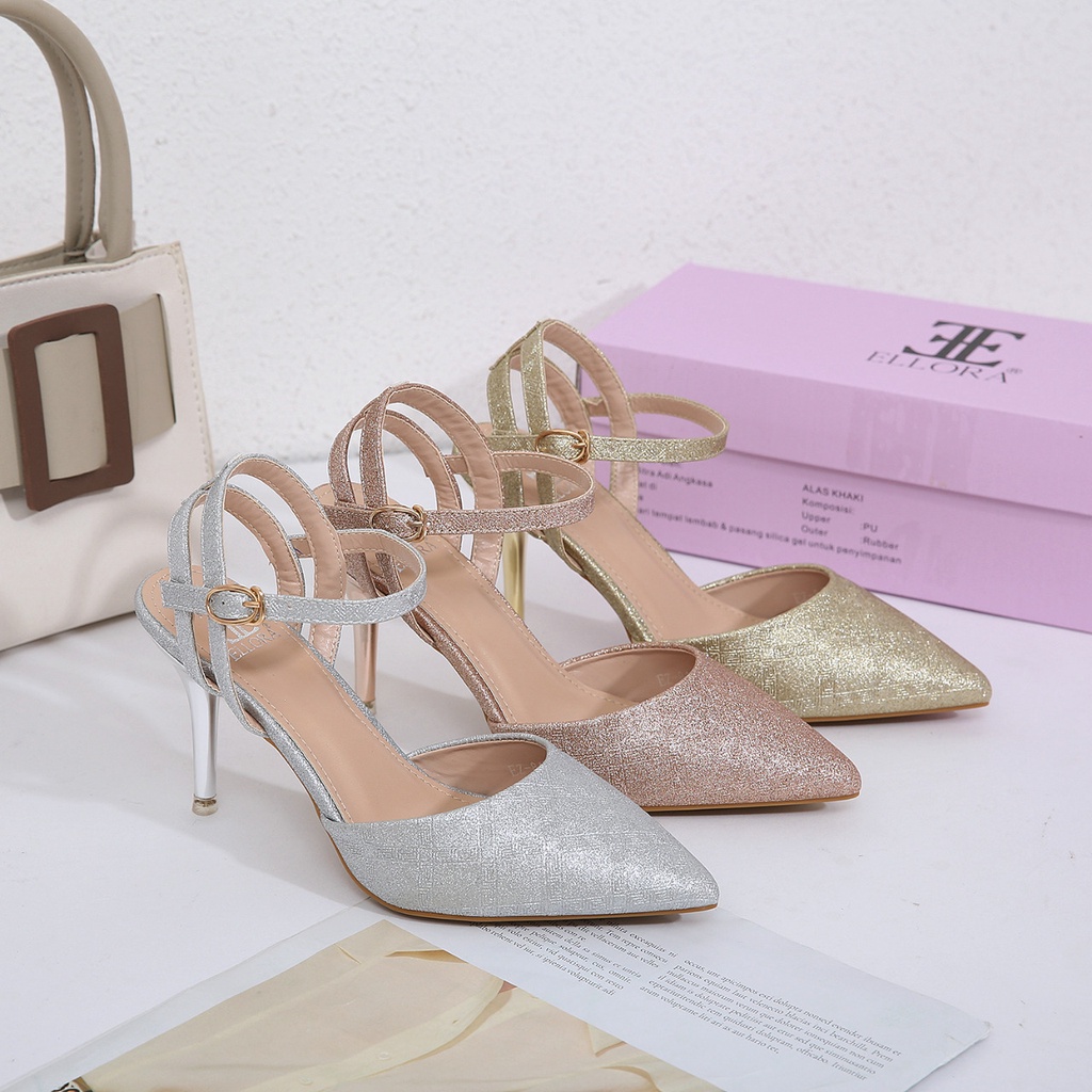Sepatu Heels Pesta Wanita 8.5 cm Ankle Strap Bahan Kanvas Glitter Import