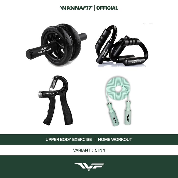 WANNAFIT PAKET 5 IN 1 | HANDGRIP AB WHEEL PUSH UP BAR SKIPPING | ALAT OLAHRAGA RUMAH TERLARIS