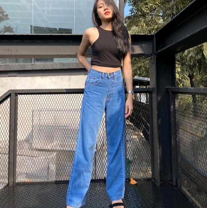 HW Loose Jeans kulot Medium Blue Celana Wanita Panjang Denim lulu