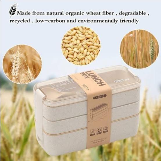 Lunch Box Kotak Makan Gandum Jerami 3 Susun Tingkat Sendok Set Bento - BIRU