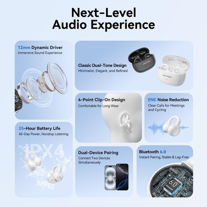 Vention Echo Clip A11 Clip On Open Ear TWS ENC True Wireless Bluetooth 6.0 IPX4 Earphones Earbuds NBWID Aksesoris Hp