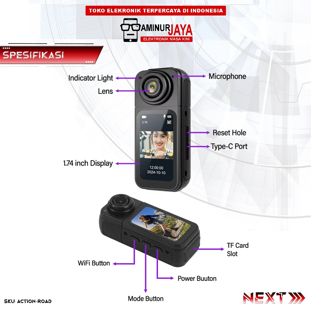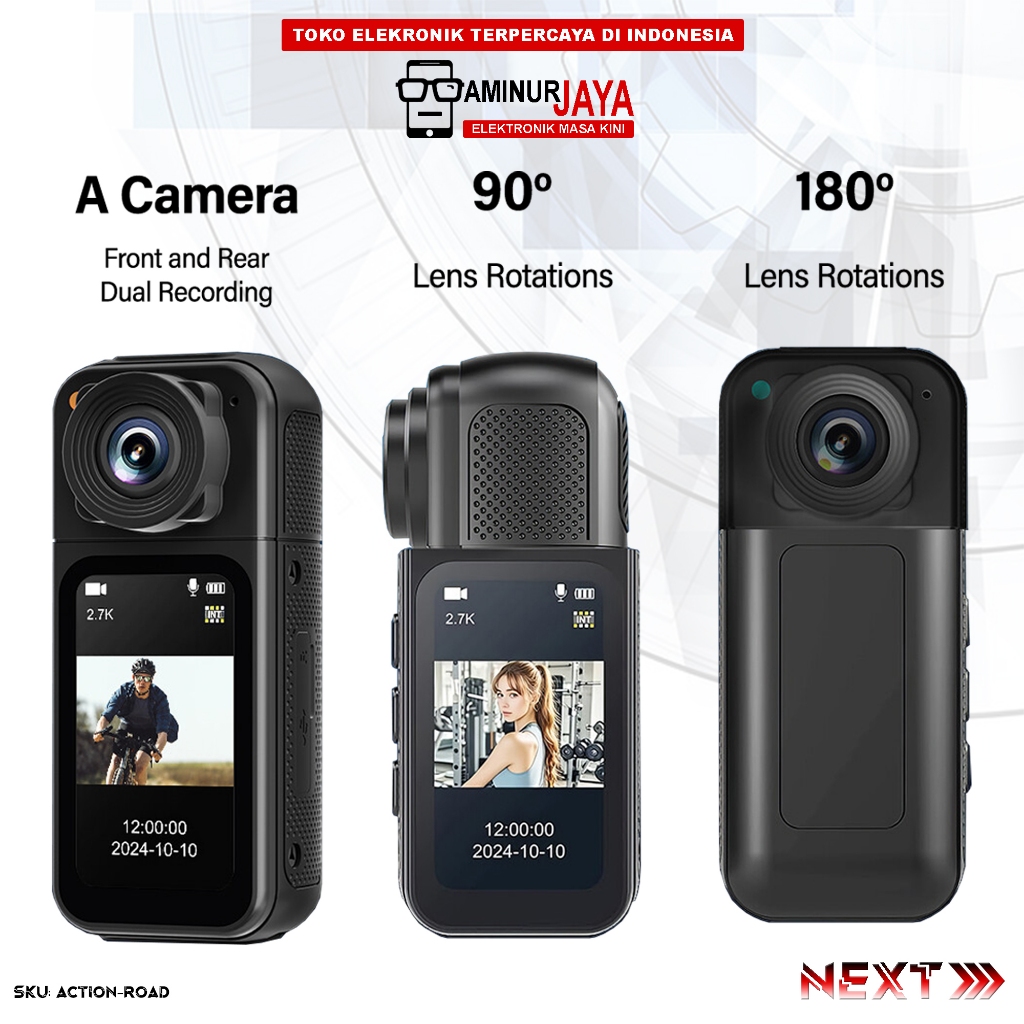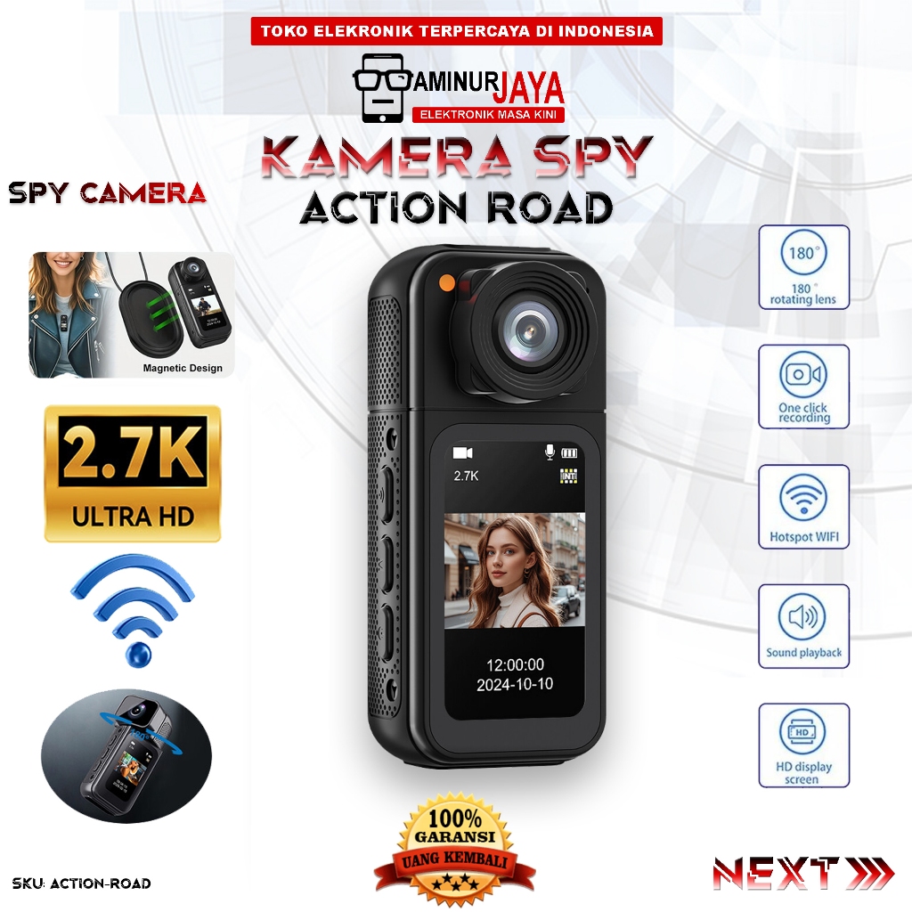 AminurJaya Mini Action Kamera WiFi 2.7K UHD 12MP 180° Rotasi Magnetik Spy Camera Roadcam ACTIONROAD