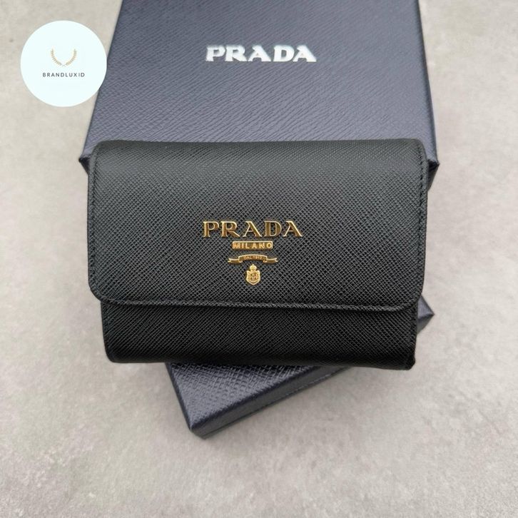 Prada saffiano trifold wallet in black ghw 8cc+ 1 bill compartment + 1 coin zipper