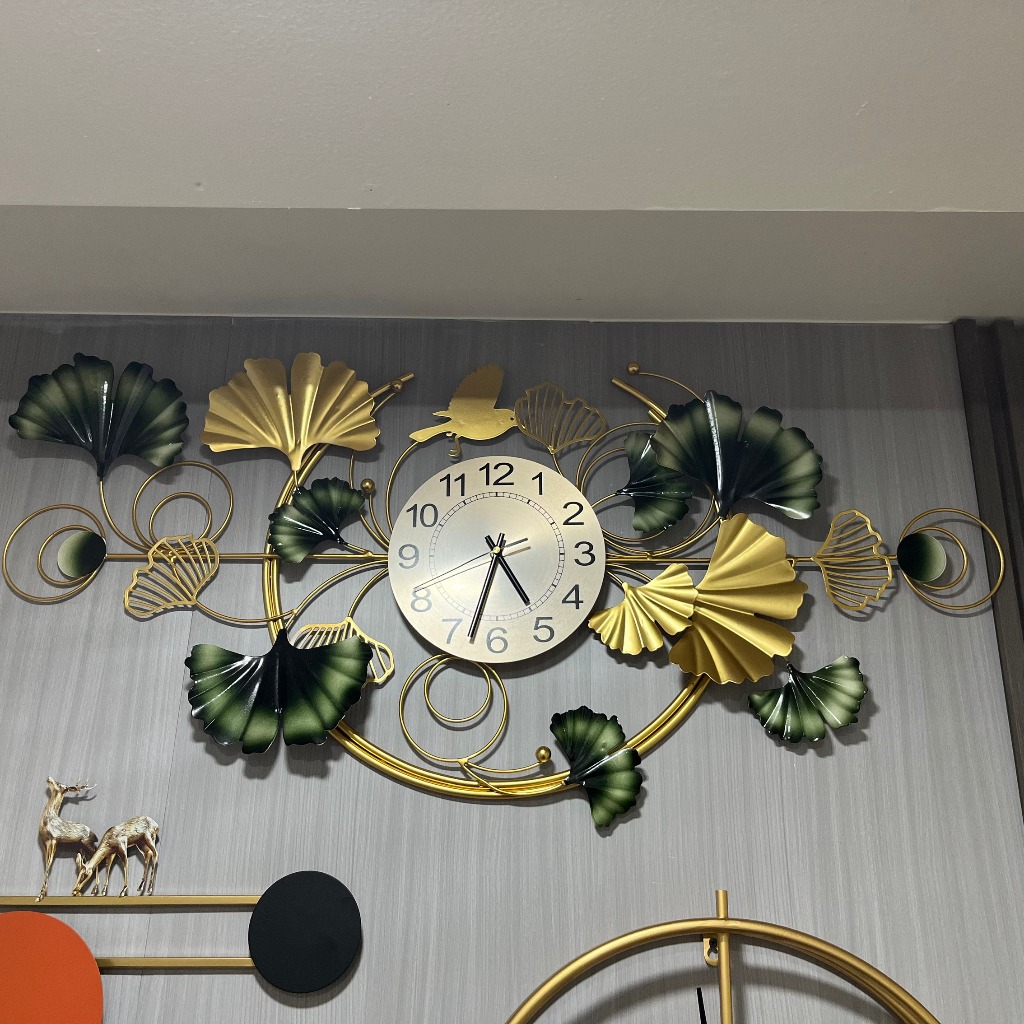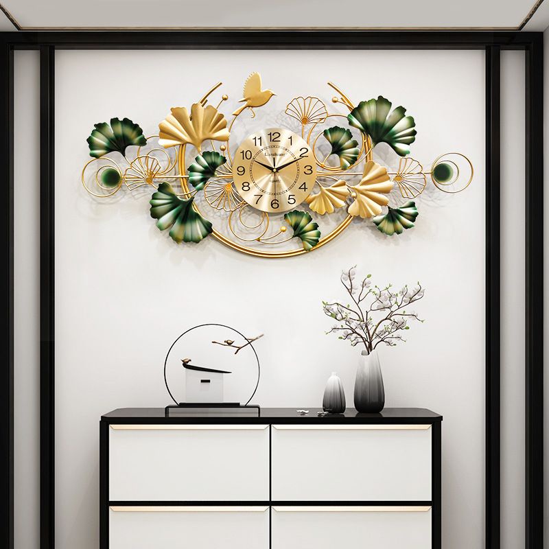 Jam Dinding Metal Green Gold Luxury Ginkgo Leaf / Jam dinding Dekorasi Rumah 3D Clock / Hiasan pajangan dinding home de