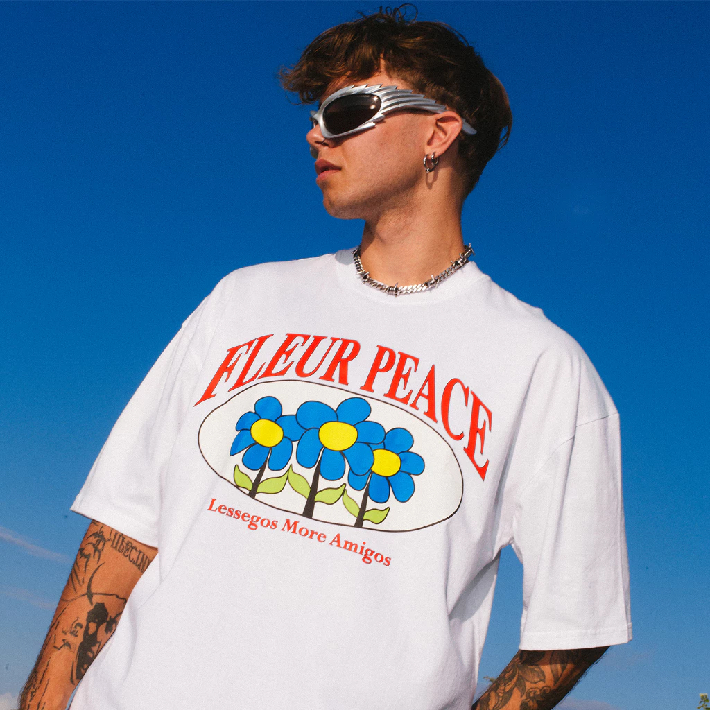 OVERSIZED WHITE GRAPHIC T-SHIRT FOR MEN – LOOSE FIT CASUAL TEE WITH PEACE FLEUR PRINT
