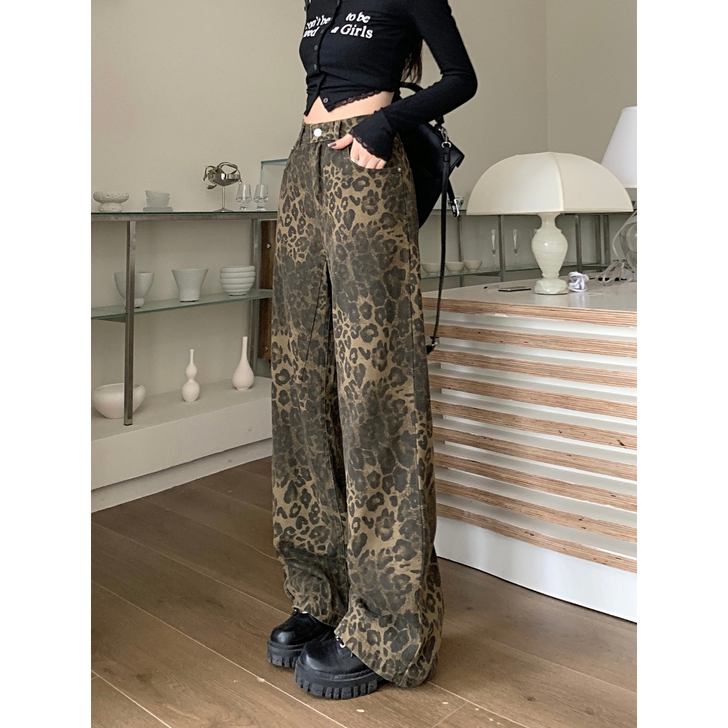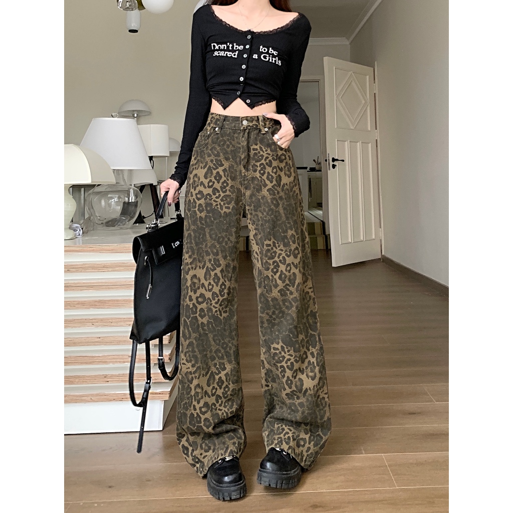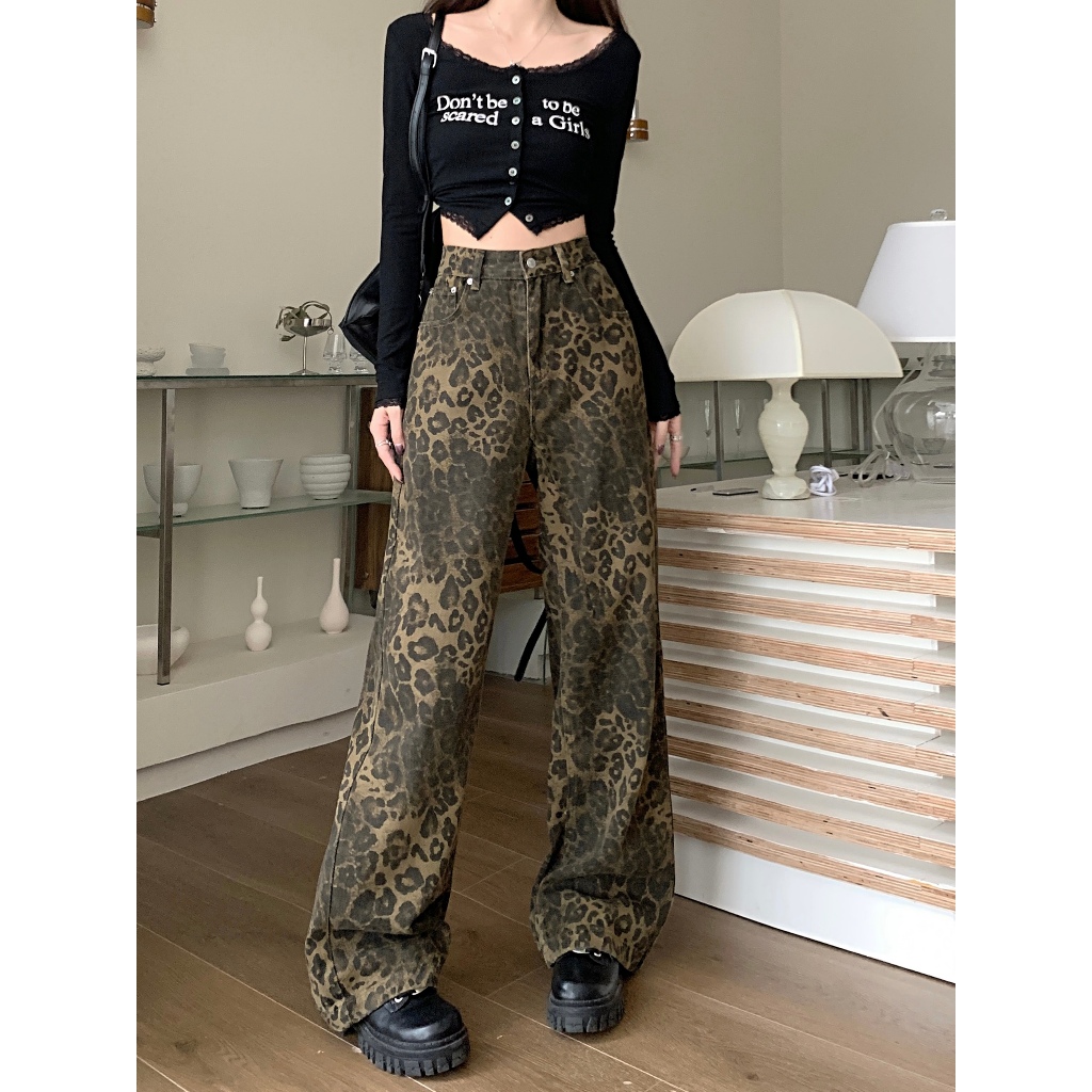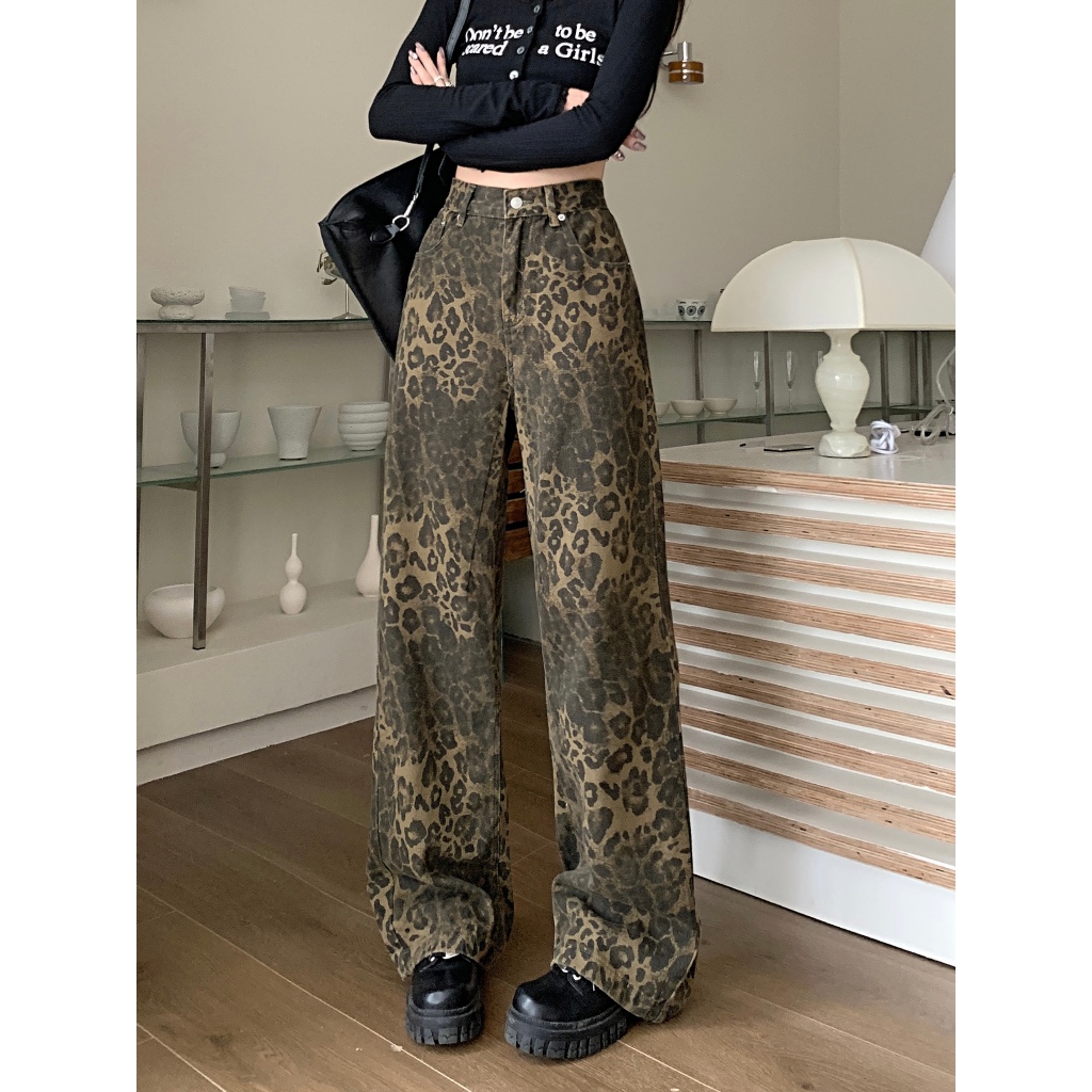 STREET STYLE LEOPARD PRINT HIGH WAIST BAGGY CELANA JEANS WANITA