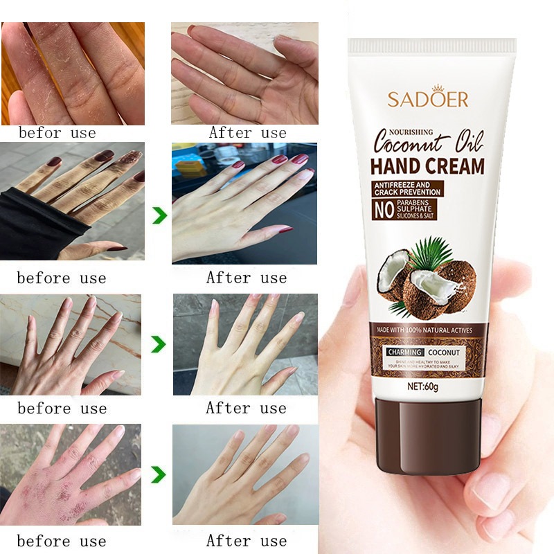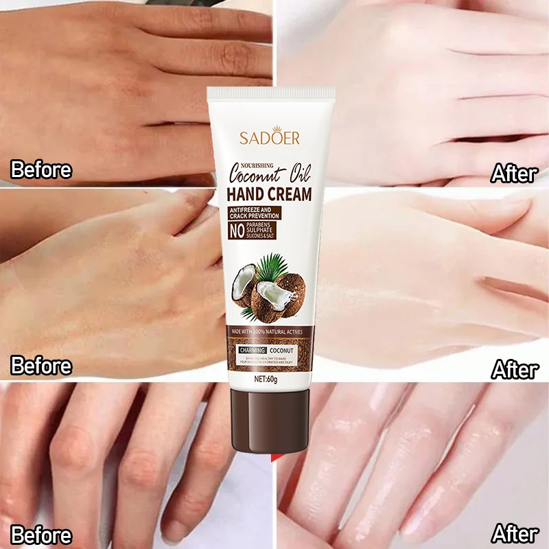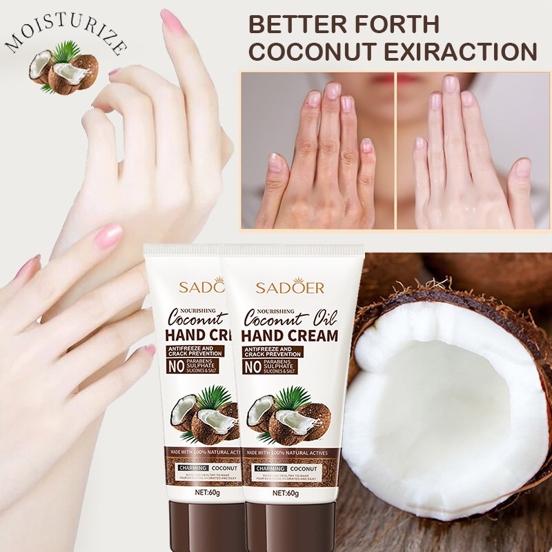 SADOER krim tangan Coconut Oil Krim Tangan Pemutih Cream 60g Whitening Hand Cream Moisturizing Vitamin E hand krim pelembut tangan Tangan keriput dan kasar 100 PERSEN original