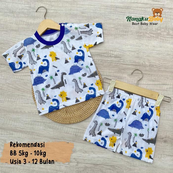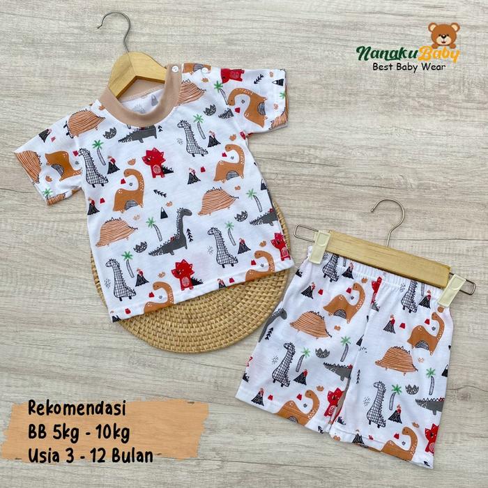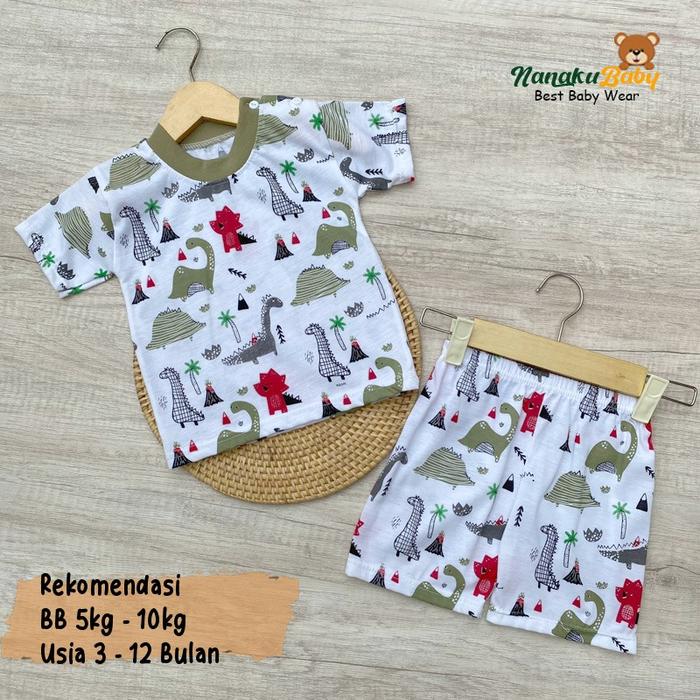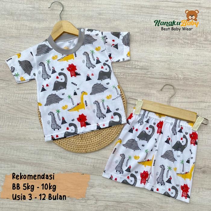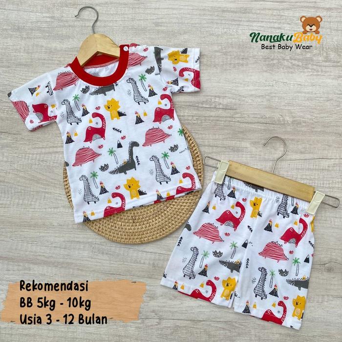 SETELAN BAJU BAYI LENGAN PENDEK MOTIF DINO USIA 3-12 BULAN - MERAH