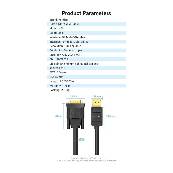 VENTION KABEL DISPLAY PORT THUNDERBOLT DP TO VGA MALE CONVERTER - HBL, 1.5 METER