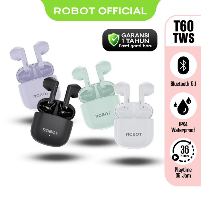 ROBOT WIRELESS EARPHONE T60 AIRBUDS BASS TWS BLUETOOTH 5.3 EARBUDS 7 JAM PLAY TIME HEADSET - GARANSI 1 TAHUN - LIGHT PURPLE