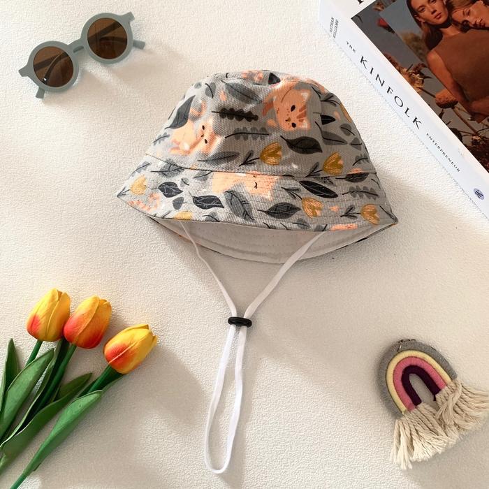 BUCKET HAT ANAK DAN BALITA USIA 6 BULAN - 8 TAHUN MOTIF KUCING DEDAUNAN BAHAN KANVAS PREMIUM - WHITE, S (6B-2TH)