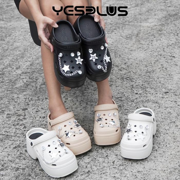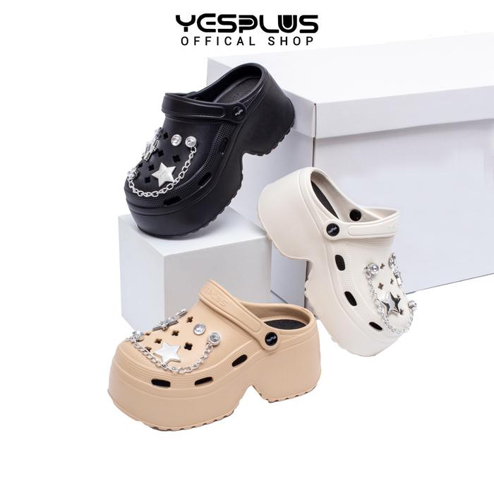 [YESPLUS] 8899-7 SANDAL BAIM WANITA MODEL TERBARU JIBBITZ BINTANG RANTAI KETINGGIAN 9 CM BAHAN EVA - HITAM , 36/37