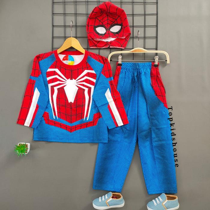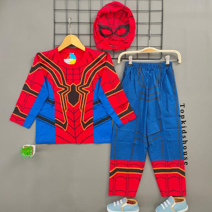SETELAN BAJU KOSTUM ANAK LAKI SUPERHERO LENGAN PANJANG TOPENG KAIN BAHAN KAOS KATUN - SPIDERMAN 2, SIZE 10 (4-5 TH)