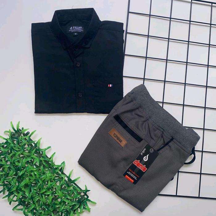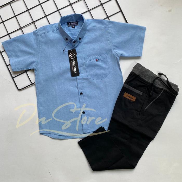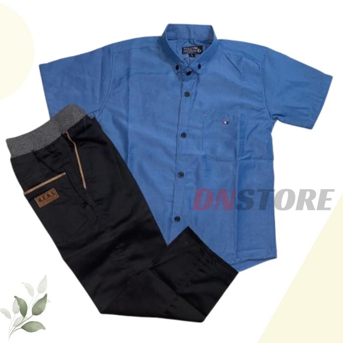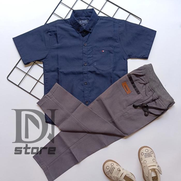 SETELAN KEMEJA ANAK LAKI LAKI LENGAN PENDEK BAHAN KATUN OXFORD/POPLIN DAN TOYOBO POLOS 4-10 TAHUN DAN CELANA CHINO PANJANG BAHAN KATUN NYAMAN DIPAKAI KIDS BAJU - NAVY CLN ABU, M 4-5 T