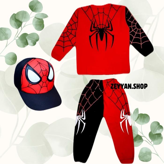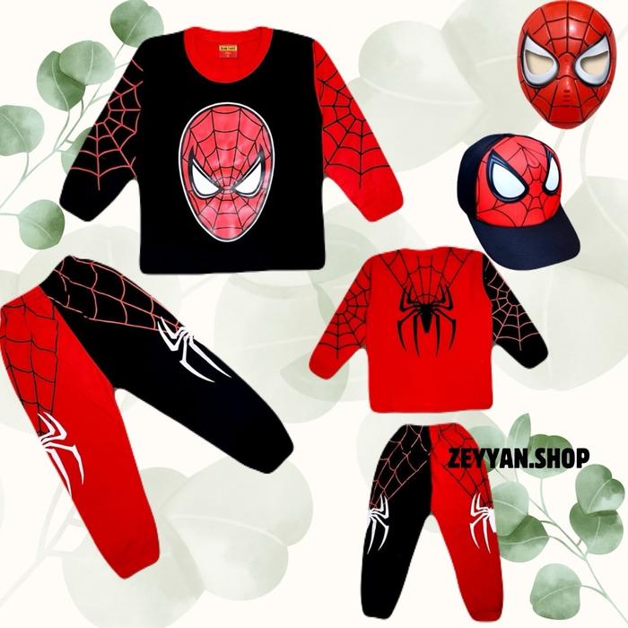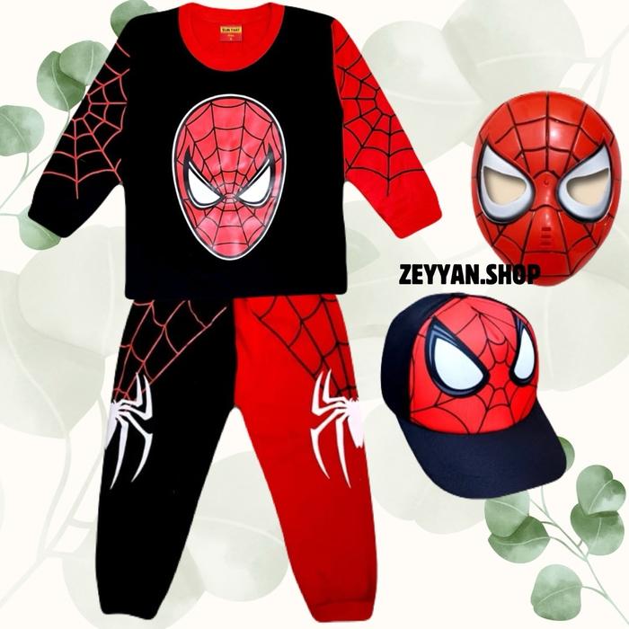 SETELAN ANAK LAKI LAKI LENGAN PANJANG USIA 1-10 TAHUN MOTIF SPIDERMAN FREE TOPENG/TOPI BAHAN KATUN ANAK-ANAK - SETELAN SPIDER PJG SAJA, 1 THN