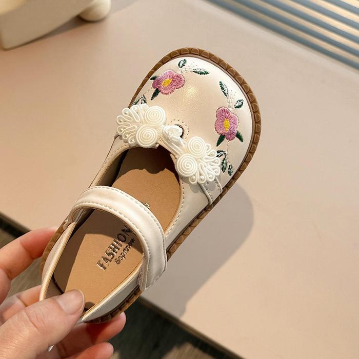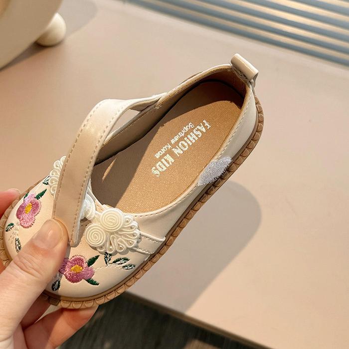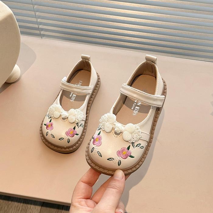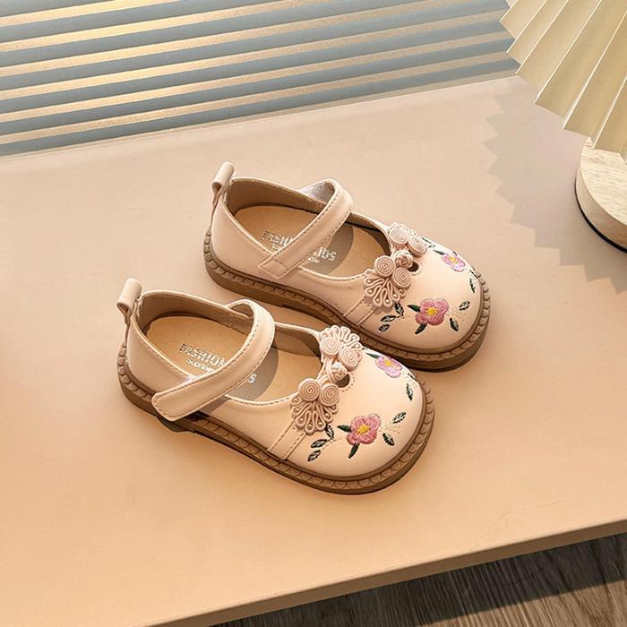 SEPATU DATAR KULIT BAYI PEREMPUAN BUNGA BORDIR GAYA KUNO SEPATU ANAK-ANAK ANTILICIN SOL LEMBUT UJUNG BULAT GAYA KOREA 2-12 TAHUN - KREM, 21