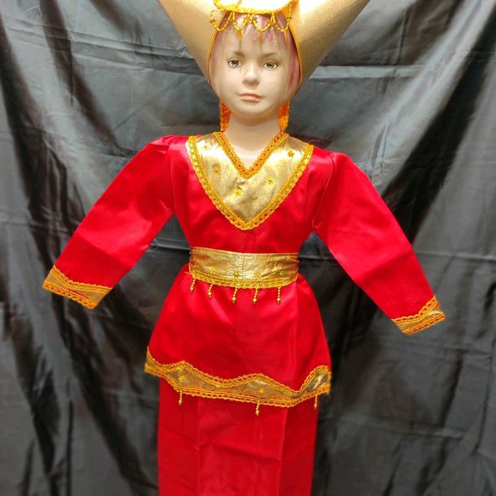 BAJU TARI ANAK PADANG/MINANG LENGKAP TOPI TANDUK UKURAN TK, SD, DAN SMP - MERAH, TK