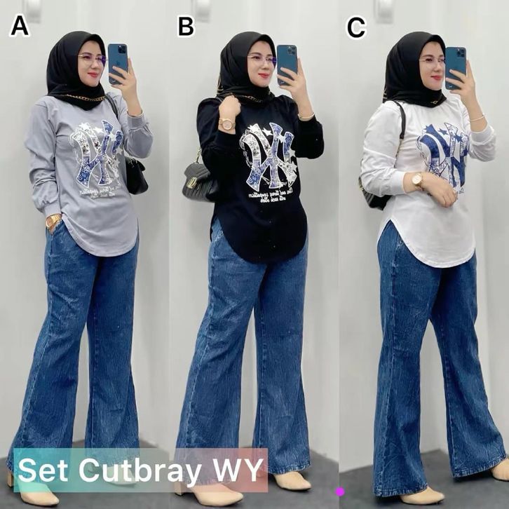 Setelan Jeans L,xl Wanita Dewasa Atasan Combed 20s Celana Cutbray Sablon Mlb Longsleeve Celana Wanita Kekinian