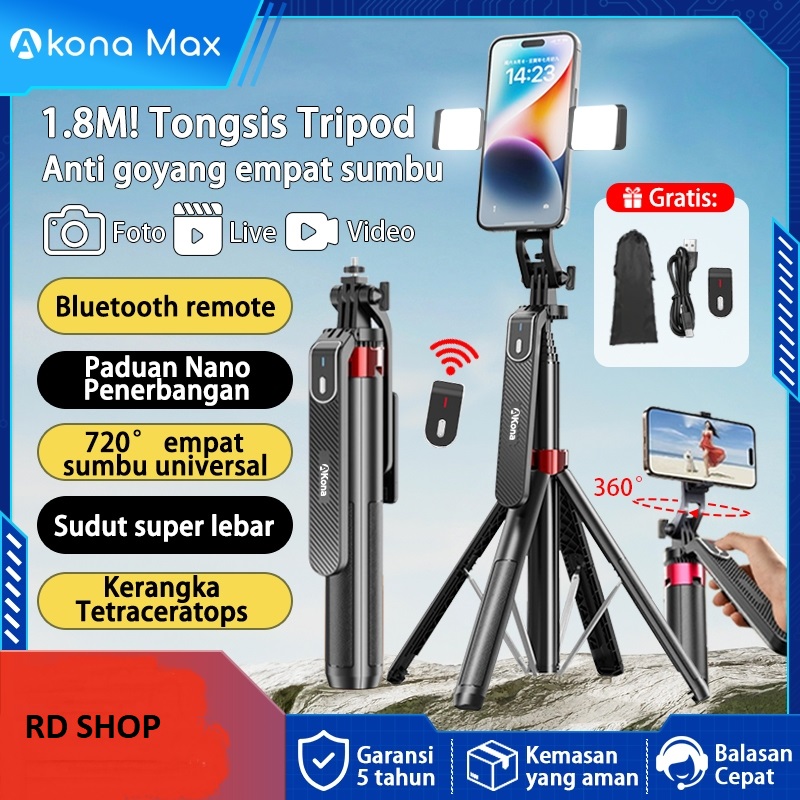 Akona 180CM Tongsis Tripod Handphone Bluetooth Remote Konten Kreator 360° Rotasi Tripod HP Anti Goyang 2 Lampu Dengan 1/