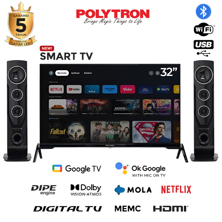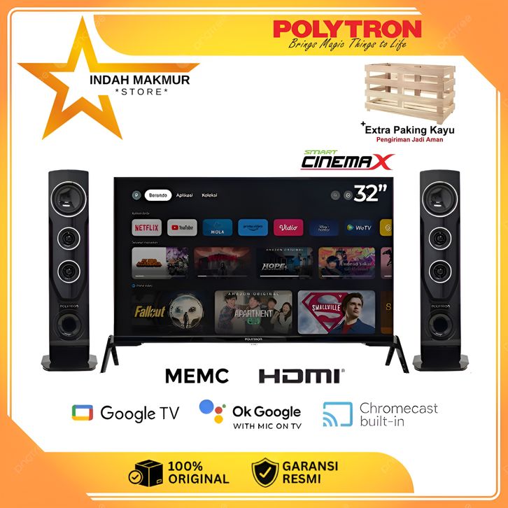 POLYTRON GOOGLE TV / SMART DIGITAL TV LED 32 INCH PLD32TG9055 CINEMAX SPEAKER TOWER ORIGINAL GARANSI RESMI