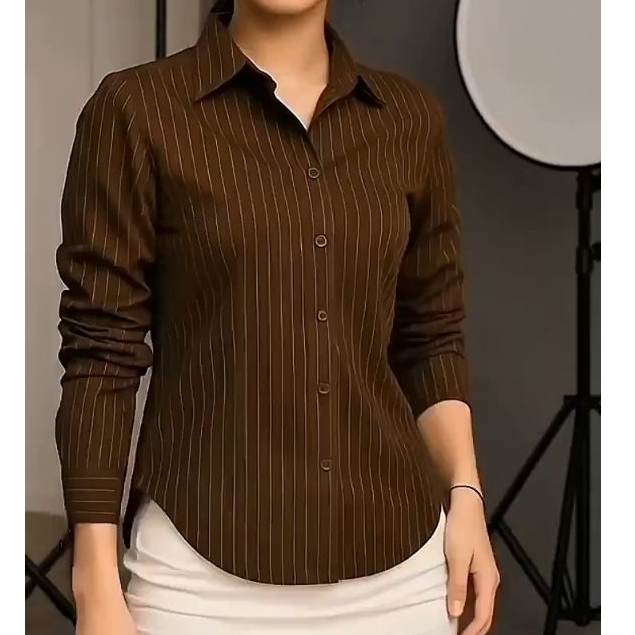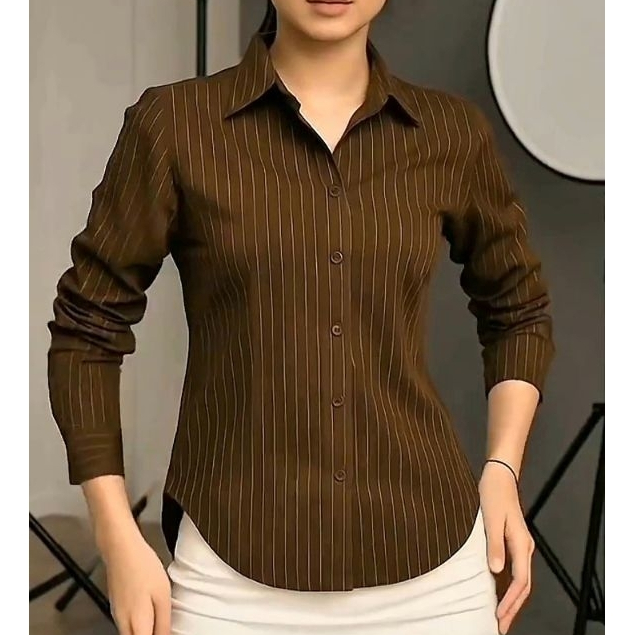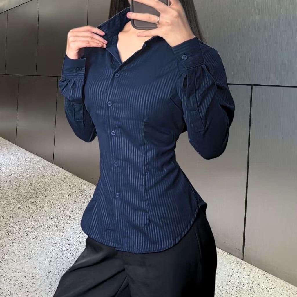 KEMEJA WANITA LENGAN PANJANG GARIS GARIS KEKINIAN TERBARU KEMEJA KERJA FITTED SHIRT