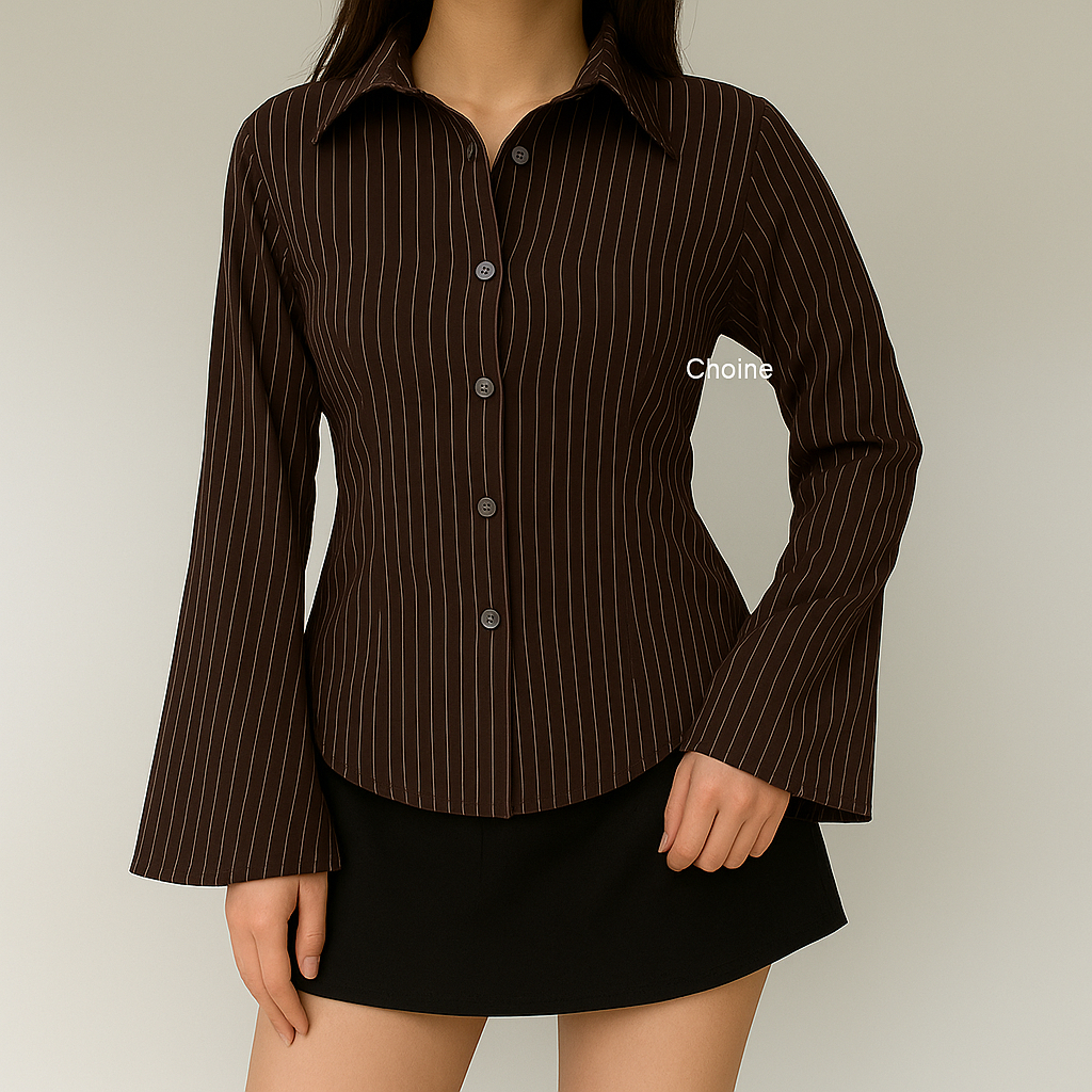 KEMEJA WHISPIE ATASAN WANITA KEKINIAN – MOTIF SALUR GARIS STRIPE SLIM FIT BODY, LENGAN FLARE FEMINIM