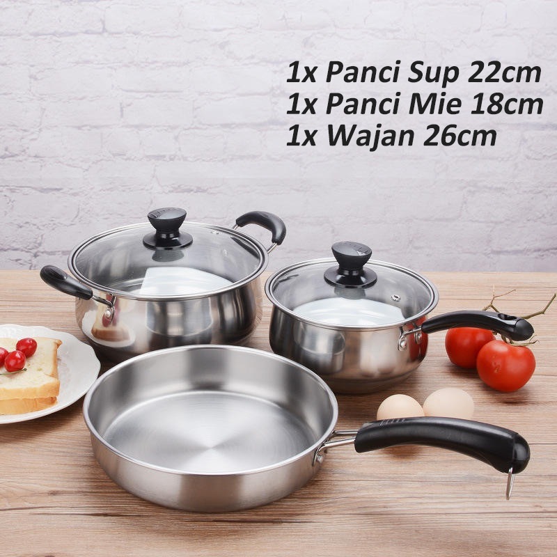 PANCI STAINLESS STEEL 3 Set Panci Sup 22cm, Panci Mie 18cm, Wajan 26cm + Penggorengan Telur Pancake 4 Lubang 24cm