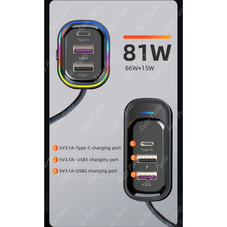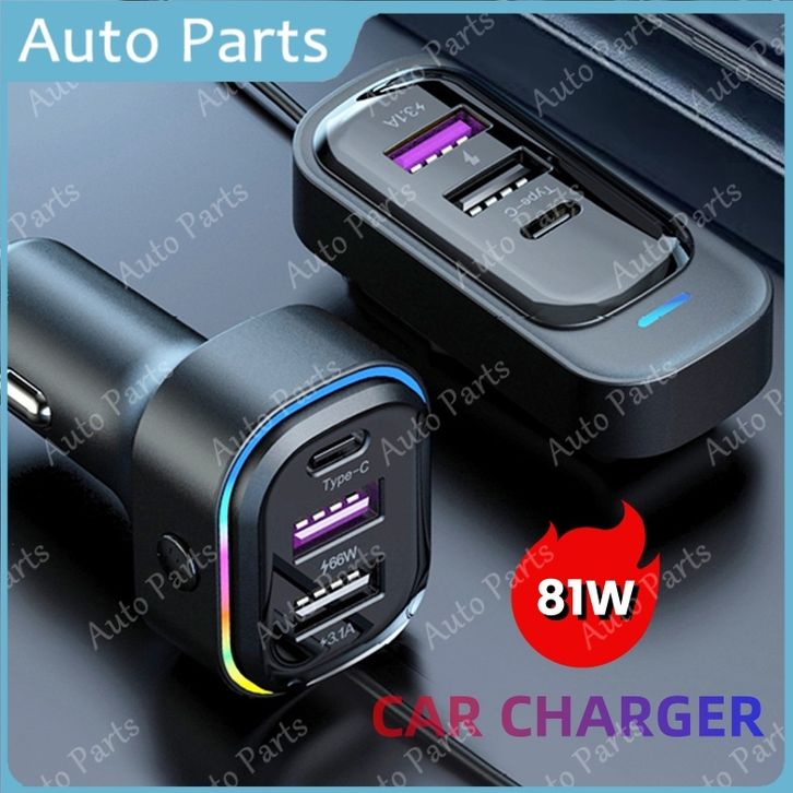 Charger mobil 100 Ori/Full 81W Turbo Fast Charger Mobil Saver PD Type C QC 3.0 RGB Led Light USB 6 Port Charge 5V 3.1A