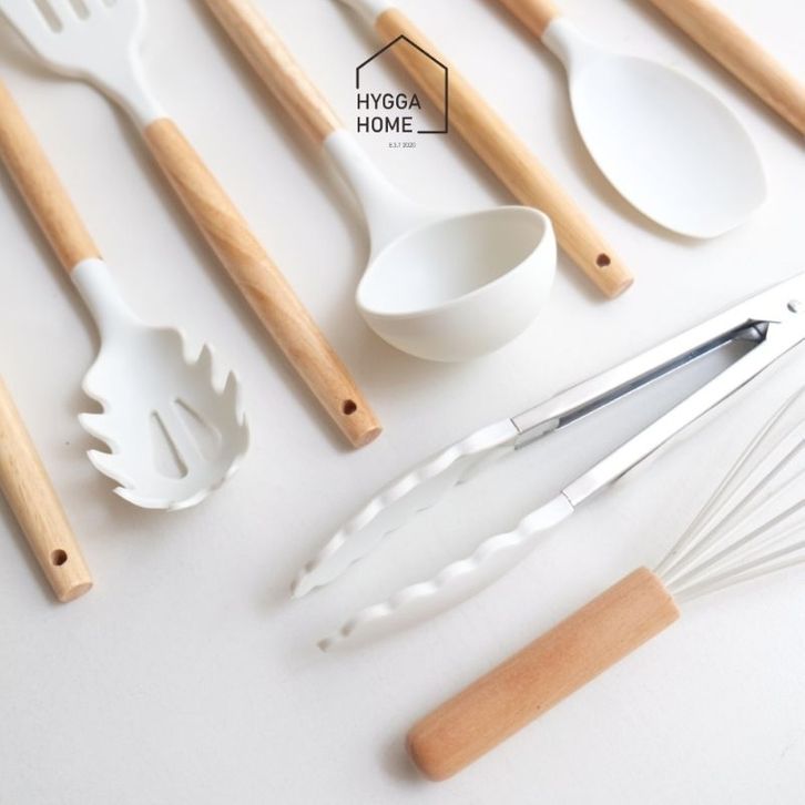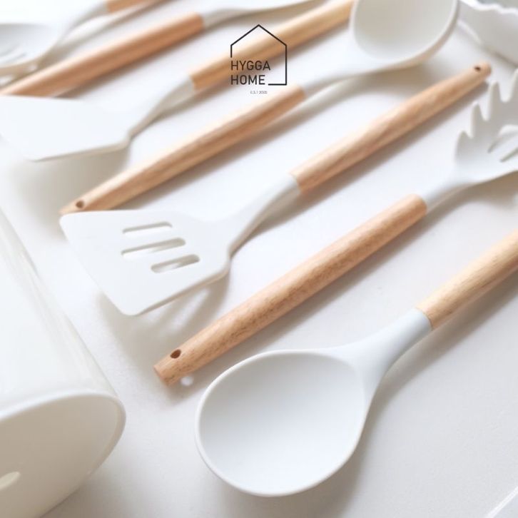 Hygga Home WHITE Silikon Sutil Pencapit Spatula Kuas Sendok Gagang Kayu/Silicone Kitchen Utensils
