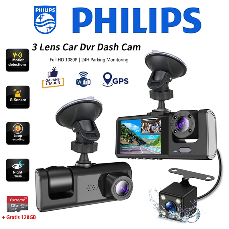 Philips 3 Cameras Dashcam Mobil 1920P HD Night Vision Loop Recording Lensa Tahan Air Dan Debu IP67