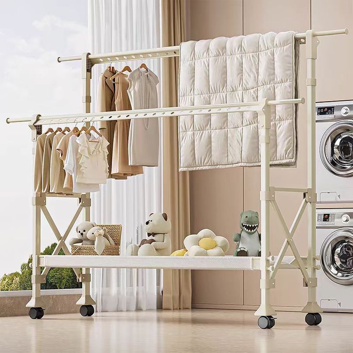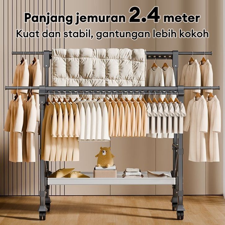 Rak Gantungan Baju Stainless Jemuran Baju Lipat Berkualitas Dengan 4 Roda Stand Hanger Double Serbaguna