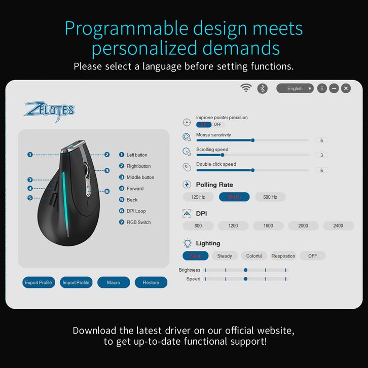 Zelotes F36 Wireless Vertical Mouse Pro9r4mmable Bluetooth 5.0 USB 2.4G