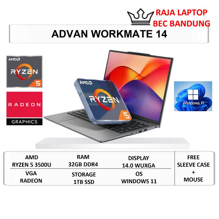 Laptop Gaming Advan Workmate 14 Amd Ryzen 5 3500U Ram 32GB SSD 1TB 14" WUXGA FHD+ Windows 11 Home