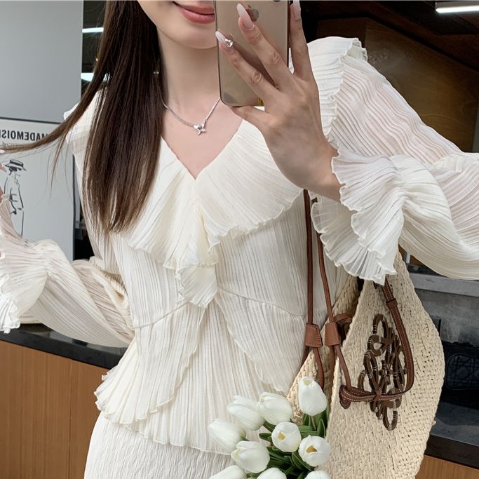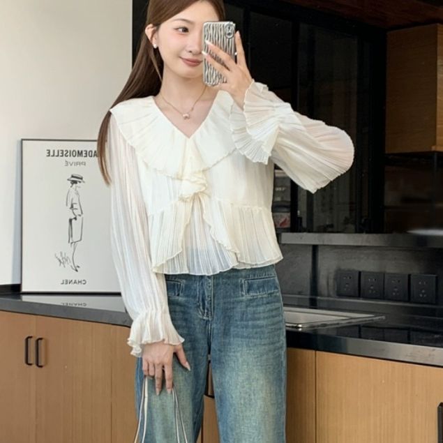 【Elegant】TokoHalo Baju Wanita Kekinian Lengan Panjang Top With Ruffle Blouse V Neck S/M/L 3263 Shirt Women Long Sleeve