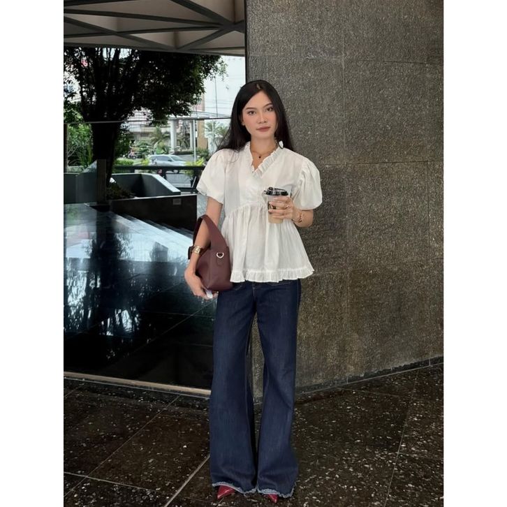 Nona the label - Leticia Katun Poplin Top Ruffle Blouse Wanita Casual V-Neck Puff Sleeve Korean look