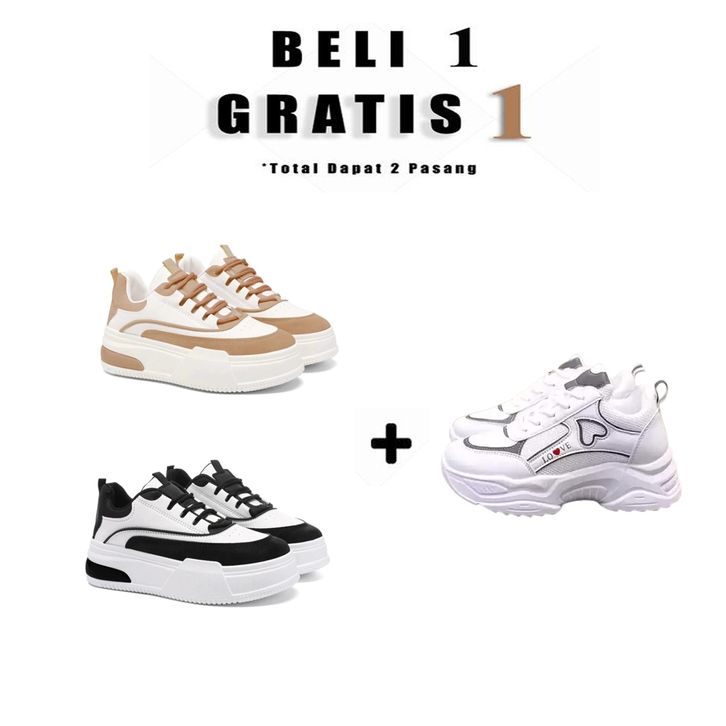 Beli 1 Gratis 1 Sepatu Sneakers Wanita 2 Warna Mocca Hitam Promo Tahun ini
