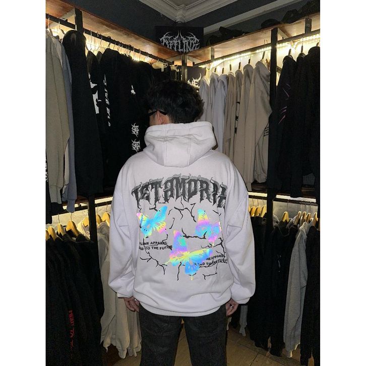Hoodie Jumper Oversize Pria Motif Metamorph Sablon Reflektif Menyala Pelangi
