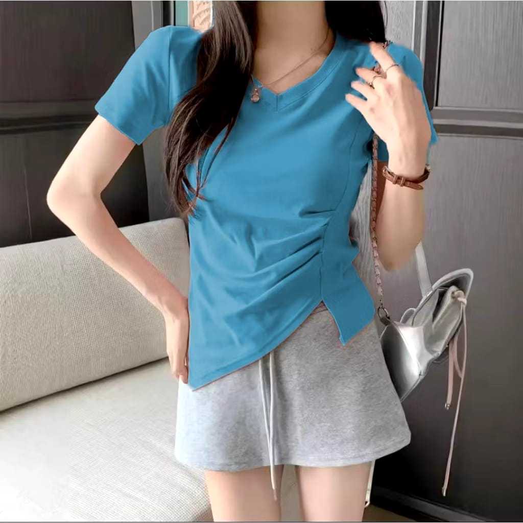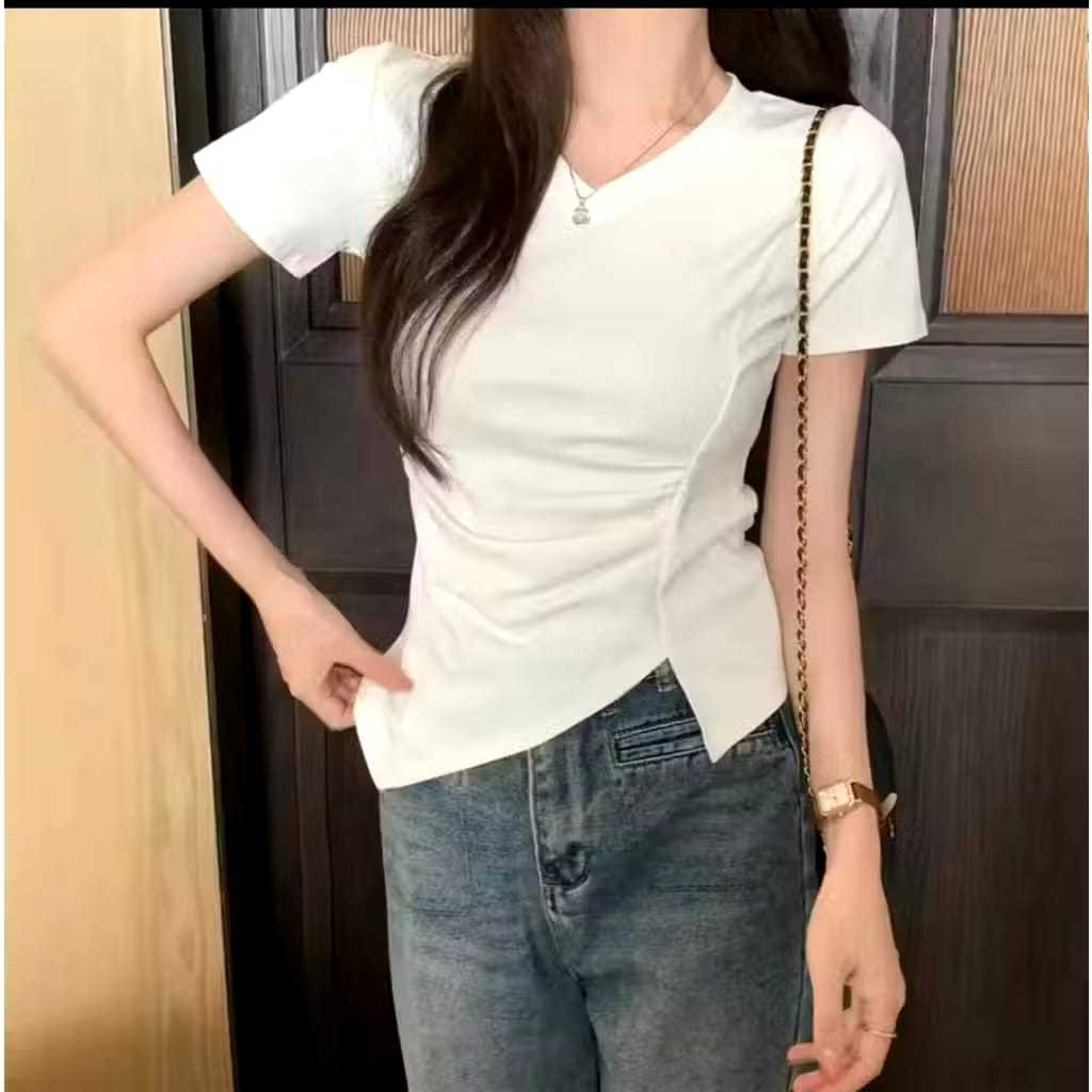 V neck Rib Knit Tee Kaos Wanita Kekinian Gaya Korea 6065 Import Terbaru Termurah