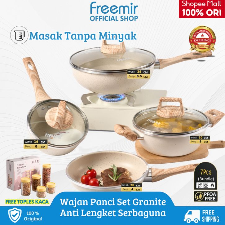 Panci Set Wajan Freemir Black 7Pcs Granite Anti Lengket Special Gratis 5Pcs Toples Kaca