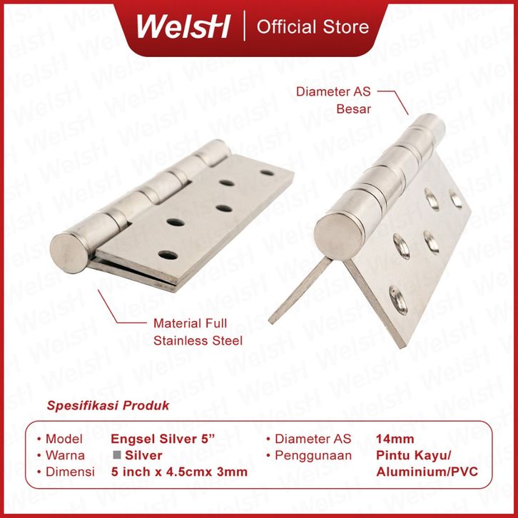 WELSH Engsel Pintu Door Hinge Stainless 5 Inch - Tebal 3 mm Warna Silver Chrome 5"