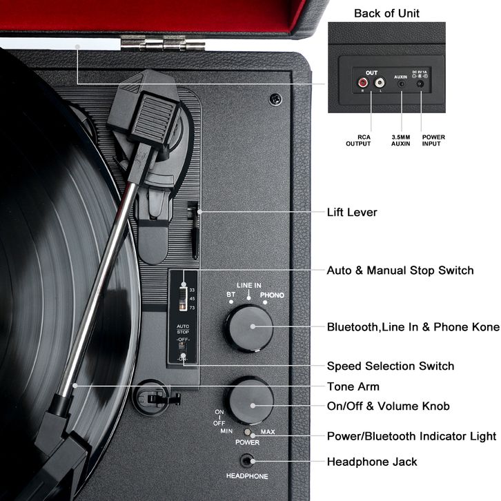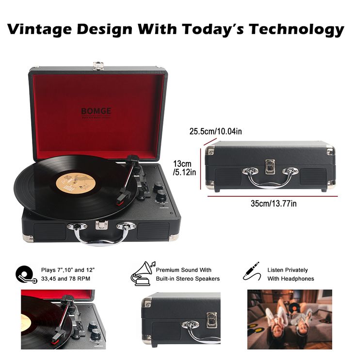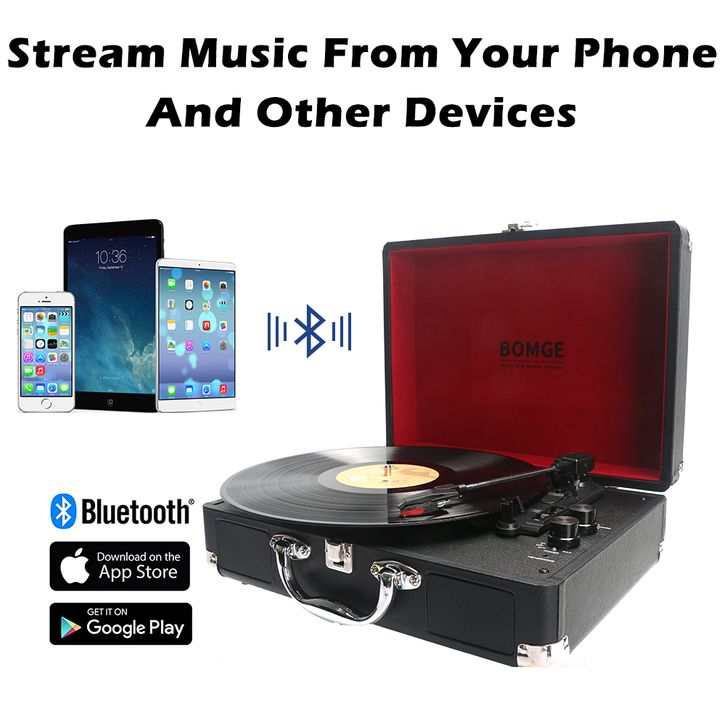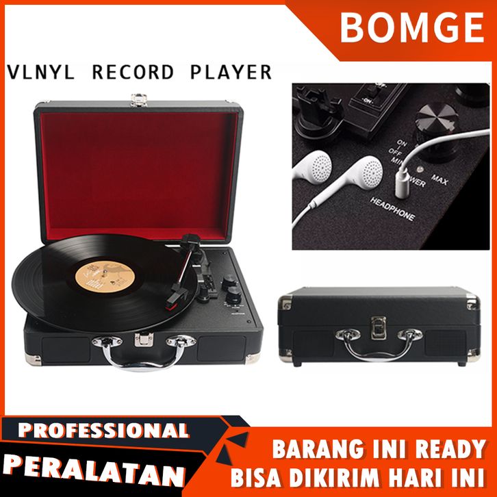 BOMGE Pemutar Rekaman Koper Portabel Bluetooth 3 Kecepatan Vintage dengan Speaker Bawaan | Pemutar Audio