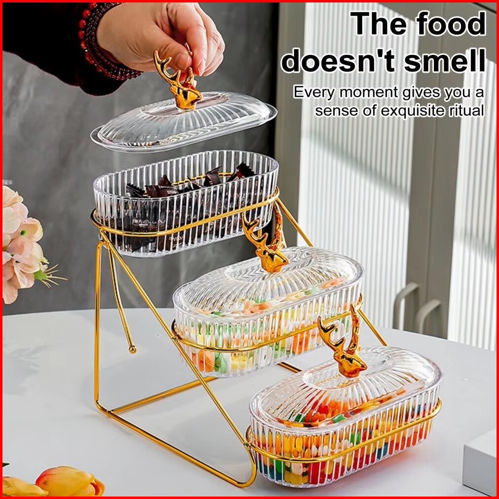 Sutang3 Tingkat Tempat Buah Rangka Besi Baki Dengan Tutup Rusa Toples Tempat Buah Snack Kopi Makanan Ringan Wadah Kotak