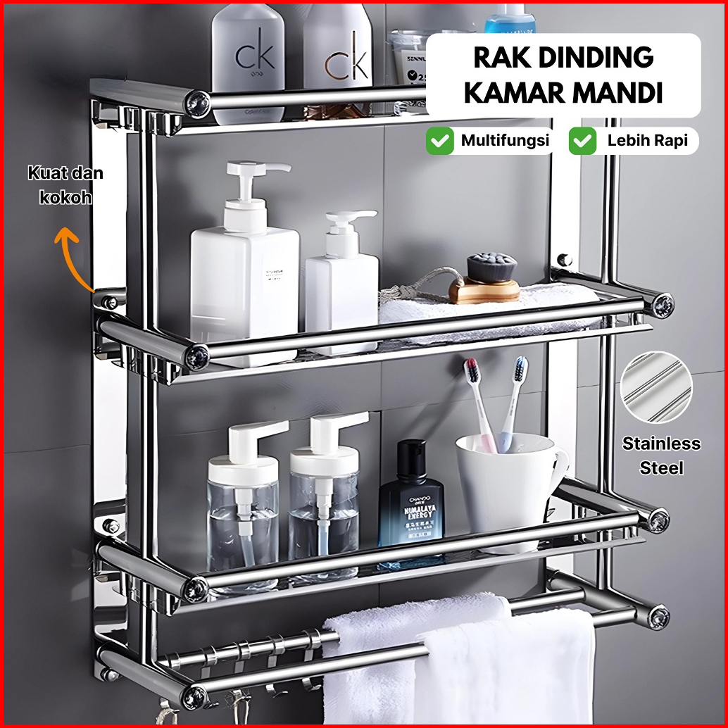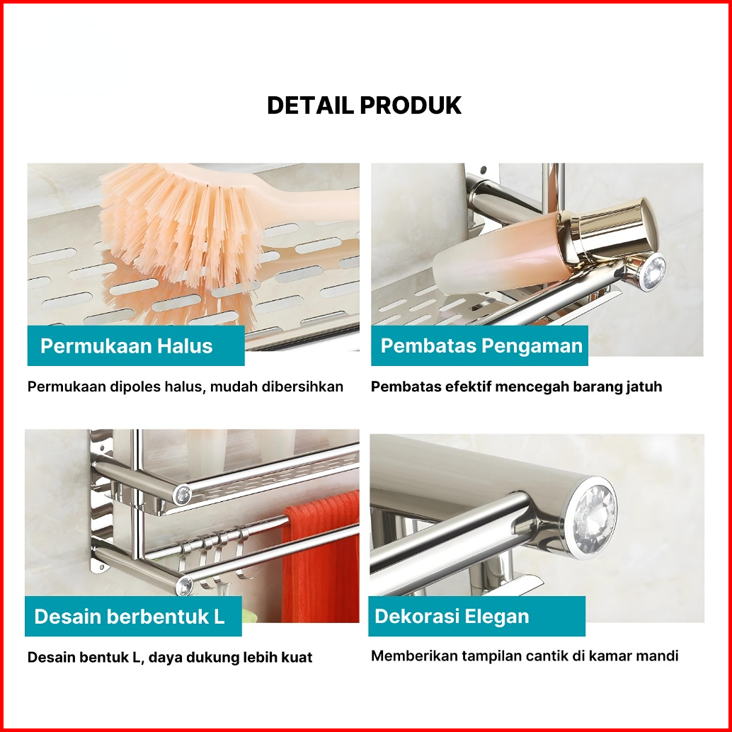 Rak Kamar Mandi Stainless Gantungan Handuk Model Tanpa Mesin Bor Sus304 Lem Super Kuat Rak Handuk Gantungan Dinding Stai
