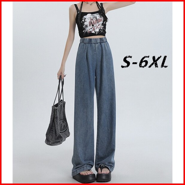 Celana Jeans Wanita Korea Pinggang Karet High Waist Baggy Straight Celana Denim Panjang Wide Leg