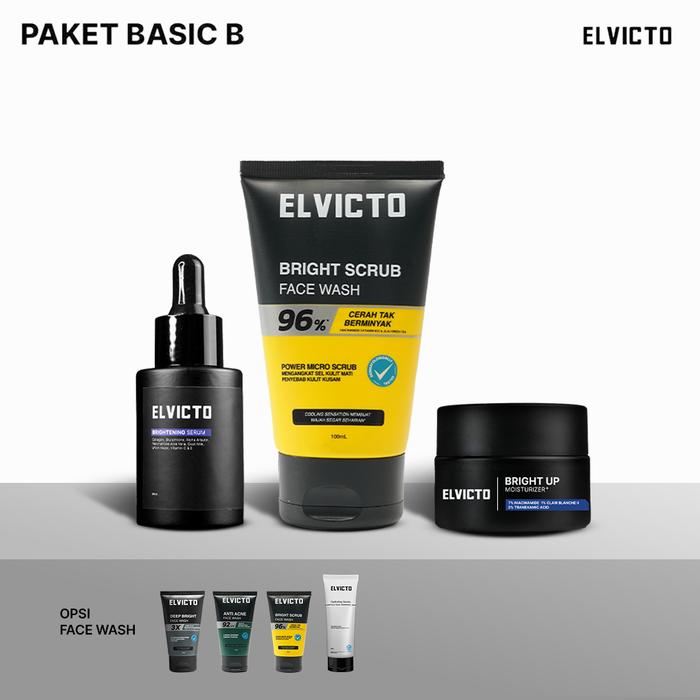 ELVICTO PAKET BASIC B SERUM FACE WASH BRIGHT UP MOISTURIZER Paket Perawatan Pria untuk Kulit Kusam,