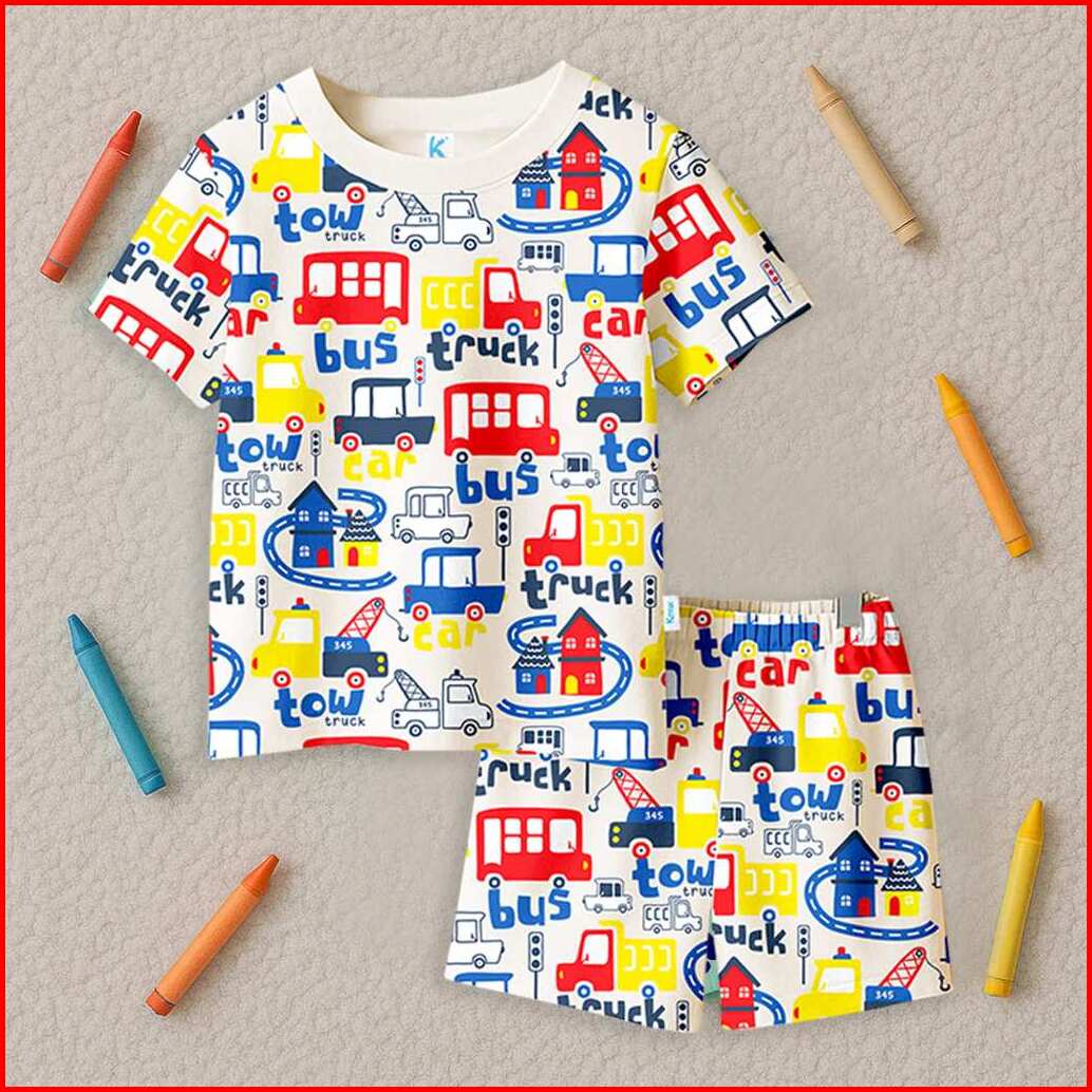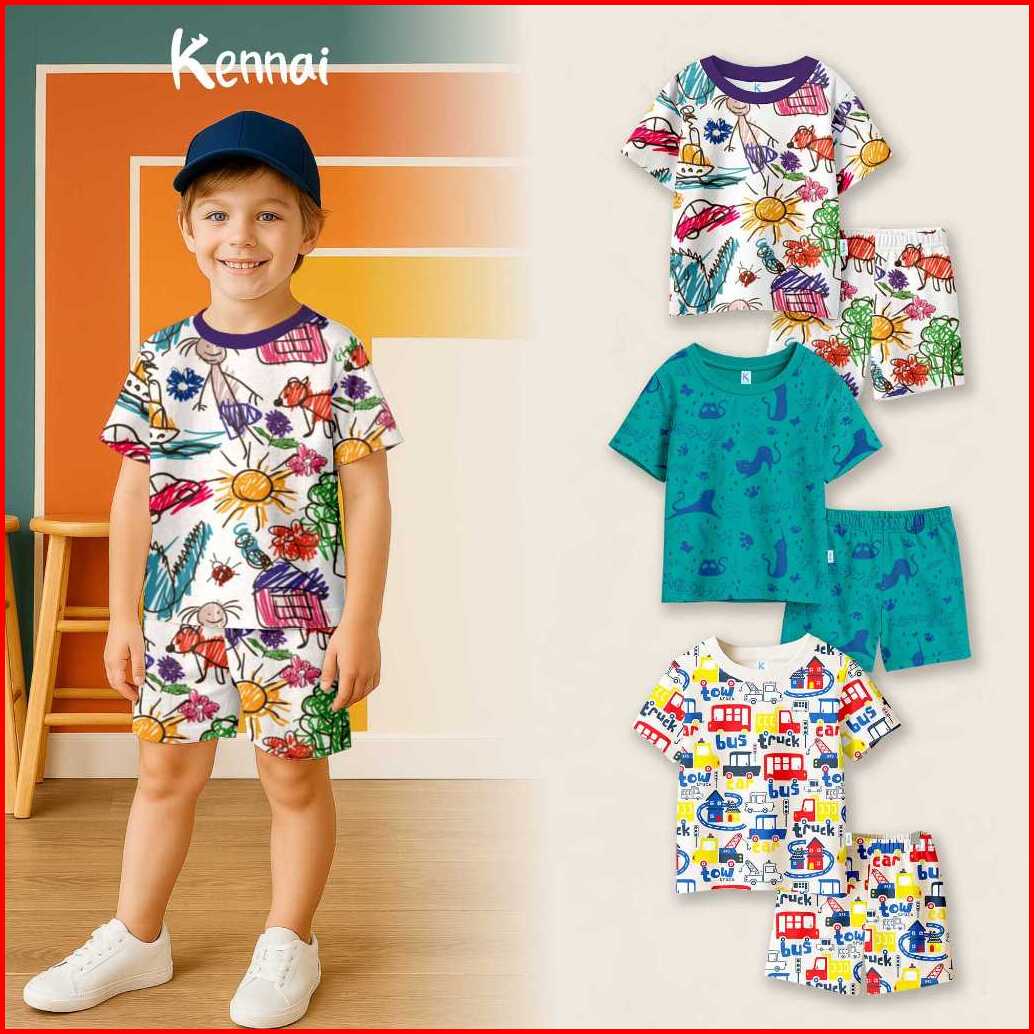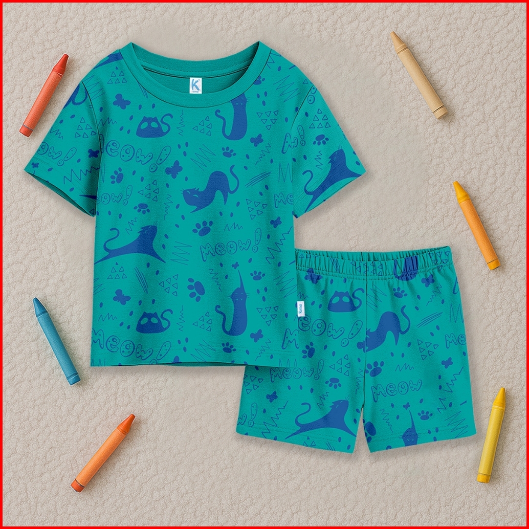 Kennai Setelan Baju Full Print Series Meow Cute Cat Unisex Usia 1-12thn