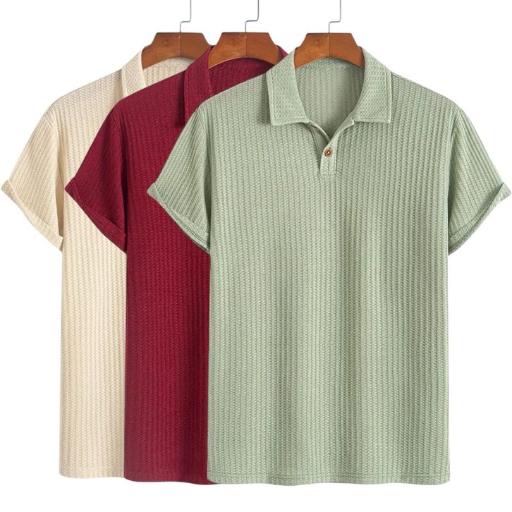 Paket 3 Pcs Kaos Polo Waffle Shirt Knit Pria Lengan Pendek Dengan Detail Berkancing Warna Solid Baju Kerah Pria Dewasa
